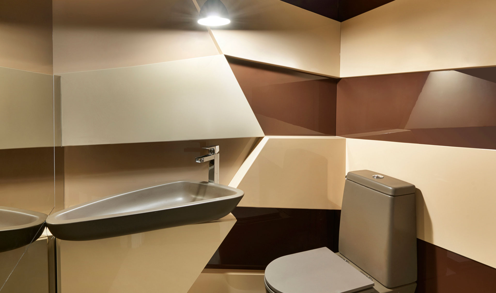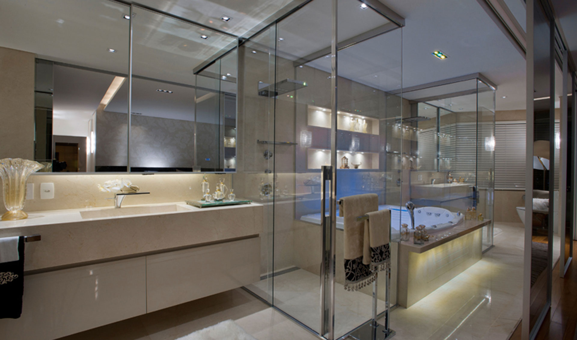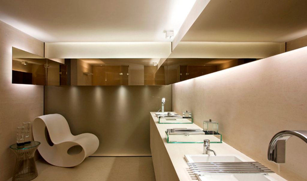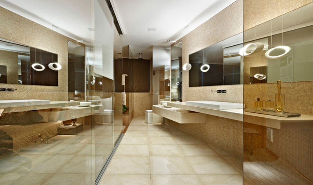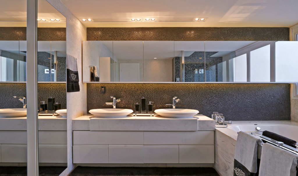 Os revestimentos para essas áreas são diversos. Os campeões de acabamento são os mármores, que dão suntuosidade ao projeto. Uma proposta muito recorrente hoje em dia é reformar essas áreas de banheiro para que virem spas em casa. Também é utilizado o conceito de lofts, em que o banheiro está integrado ao quarto. Uma proposta diferenciada e muito prática é dividir o banheiro do casal entre espaço para a mulher e para o homem, fazendo duas bancadas, duas bacias sanitárias, de forma a deixar o espaço bem personalizado para as pessoas que vão utilizar.