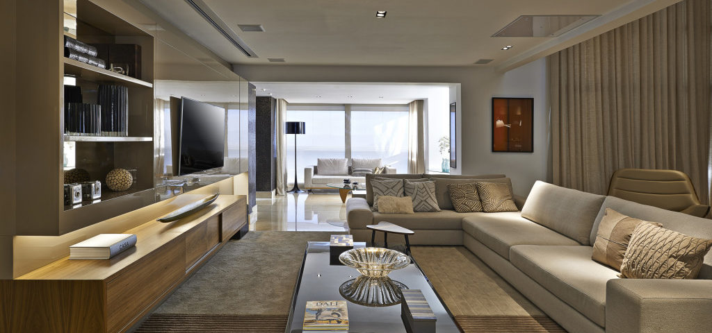 Tapetes devem ser um pouco mais largos do que a mobília com que estão interagindo. Eles precisam se estender um pouco para a esquerda e para a direita do sofá ou da poltrona. Caso contrário, com um tapete menor que a área dos móveis, o ambiente parece mais fracionado e desalinhado.